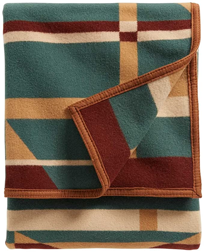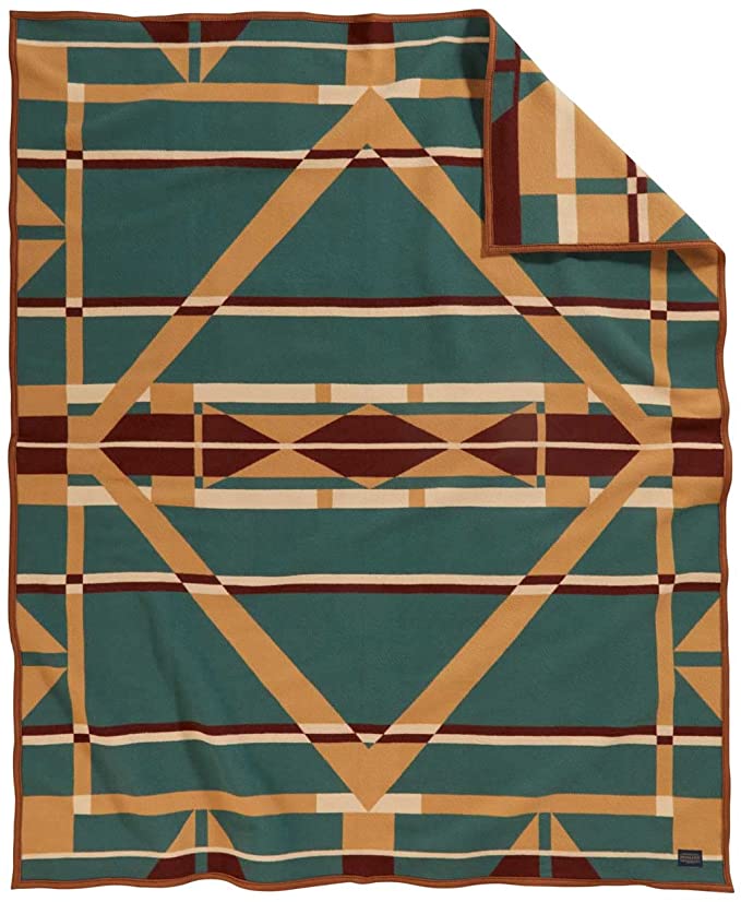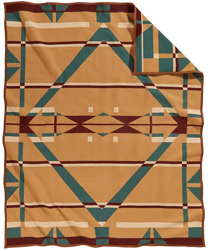 Created by Native American artist Ramona Sakiestewa, this USA-made wool blanket pays homage to the strength and utility of the cedar tree, considered by many tribes to be sacred. Bark and berries from can be used for medicine and food, with wood used for building and carving. This pattern embraces the colors of the tree, with an enclosing, protective diamond at the center.