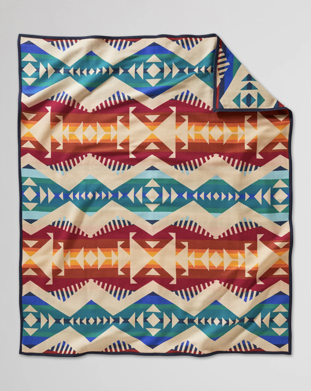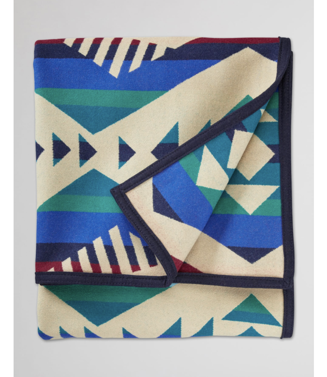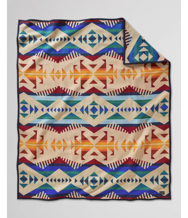 This USA-made wool blanket features multi-directional arrows symbolizing the routes of people who made petroglyphs—carvings on rock walls—to record their specific cultures and journeys through the area now known as Los Lunas. This small New Mexico town is neighbor to Laguna Pueblo, the Rio Grande Valley, and Hidden Mountain. The area’s abundant petroglyphs include figures seen nowhere else in the Americas.