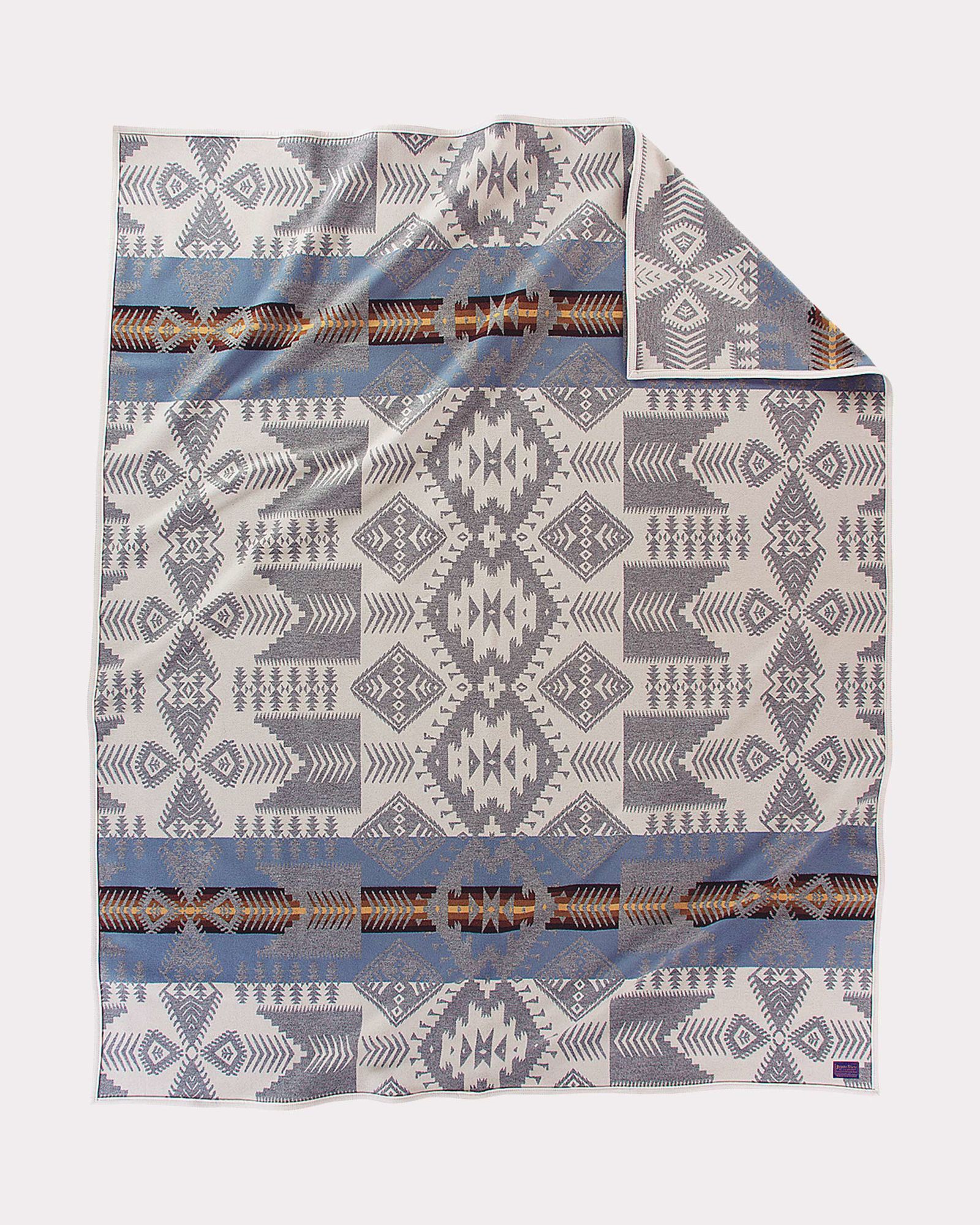 Inspired by a classic Pendleton design from the 1920s that was rediscovered in a private collection. This intricate pattern features stylized stars, diamonds, arrows and waterbug motifs in a palette that echoes the white and grey bark of Aspen trees against a blue sky. Muted colors create the look of a favorite vintage blanket.
